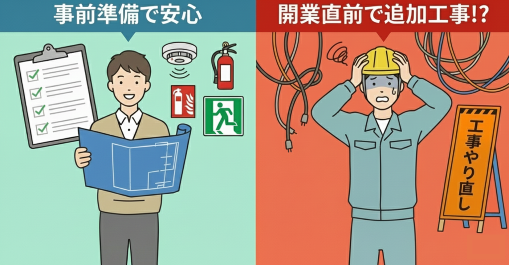 「いよいよ来月オープンだ!」 そう思った矢先、消防検査で**「この壁があると感知器が足りません」「この人数だと避難ハシゴが必要です」**と指摘され、壁を壊して配線をやり直す——。